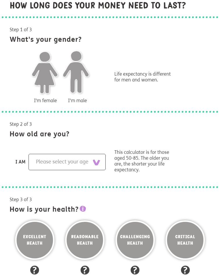 This calculator helps give an indication of the chances of living to certain ages. It's based on your own assessment of your general health and UK pensions industry data (The Continuous Mortality Investigation 2017).